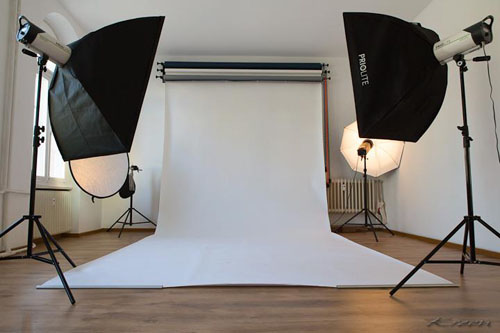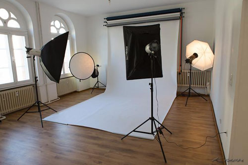 Das Studio ist eingerichtet mit verschiedenen Hintergründen, Bodenbelägen und anderen Requisiten. Des Weiteren mit verschiedenen Blitzköpfen, Softboxen, Striplights, Strahlern, Reflektoren und anderer technischer Ausstattung.